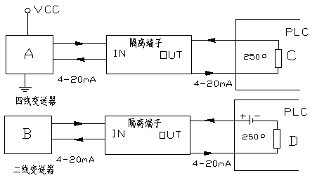 B:二線制變送器,它需要隔離端子供電。