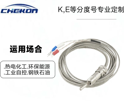 WR□T-01 型壓簧固定式鎳鉻 - 銅鎳熱電偶通過壓簧將熱電偶端部與被測物的表面緊貼, 以提高測量的可靠性和準確性。壓簧式固定熱電偶與顯示儀表等配套使用,可直接測量 0~400 ℃ 范圍內(nèi)的溫度。壓簧式固定熱電偶帶有軟性延長導線,可以自由彎曲,具有熱響應(yīng)時間小,使用方便等特點,適用于塑料擠出機、輕紡、食品等工業(yè)。